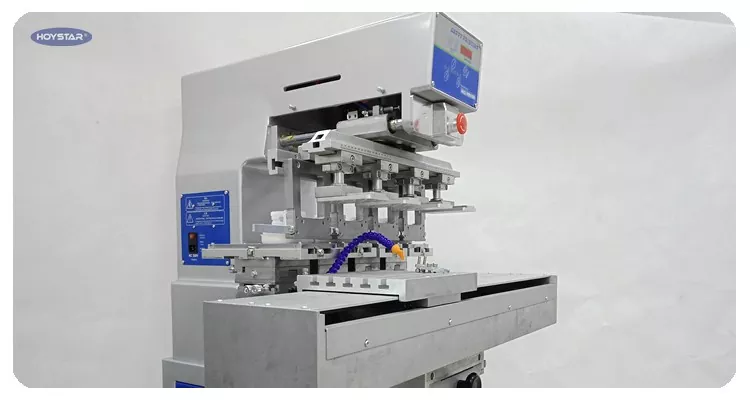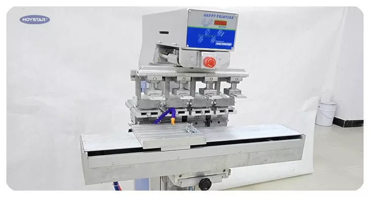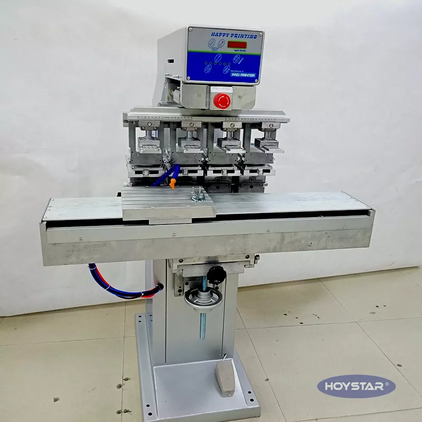 شٹل ورک ٹیبل اور 4 پرنٹنگ ہیڈ کے ساتھ 4 رنگ پیڈ پرنٹنگ مشین ، مشین کو چار سروں کے ساتھ 1 کلر پیڈ پرنٹر کے طور پر استعمال کیا جاسکتا ہے۔