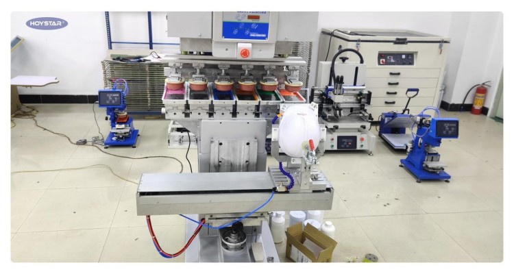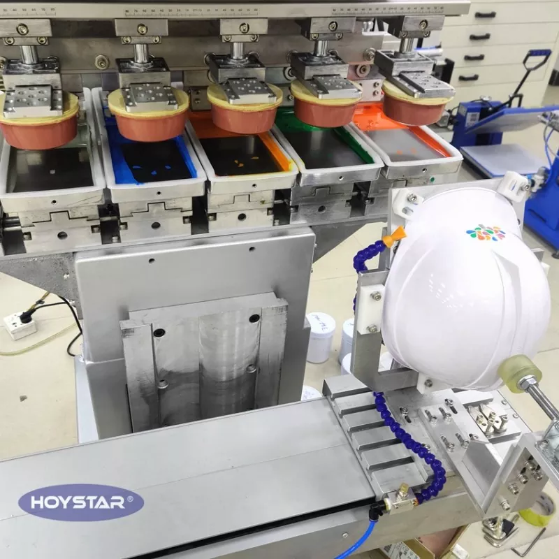 شٹل ورک ٹیبل سے لیس 6 رنگین سیفٹی ہیلمیٹ پیڈ پرنٹنگ مشین ، ایک بار میں 6 رنگ پرنٹ کرسکتی ہے۔